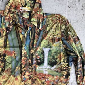 This is a great 1970s disturb button down shirt. Please look at the pictures, It is missing the fourth button. Easily take the one off the collar and move it down. Stretch nylon, made in Italy. Across the shoulder is 18 inches, pit to pit is 21.5 from the top of the shoulder bottom is 28.5 and the shoulder to the bottom of the sleeve is 25.5.