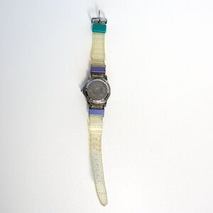 flexible plastic band with belt buckle closure (band has yellowed slightly)