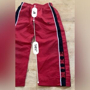 Vintage Nike size 4 track suit. Set features jacket/pants made of 100% red/black poly fabric; full zip jacket with hood and logo zipper, mesh lining, elastic cuffs, even hem, white piping details, large wordmark logo across back, and signature red embroidered swoosh at left chest. Pants feature an open hem, mesh lining, encased elastic waistband, side on-seam open hand pockets, white accent piping, wordmark logo at left hem, and signature black embroidered swoosh below left front pocket. Absolutely adorable! Great attention to detail! Light area on back left leg, and small re-tack to left underarm seam (see pics). Vintage! Very good preloved condition from a smoke free home. Refer to pictures for measurements/condition (measurements are approximations).