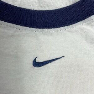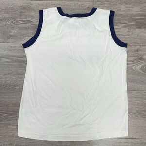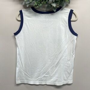 Vintage Nike Embroidered Center Swoosh Crewneck Tank Top in size L (12-14). Great preowned condition. 100% cotton, made in USA, white with navy ribbed knit trim on arms and neckline and embroidered swoosh logo on center of chest. Please see photos for approximate measurements and details. Item may show difference in color based upon photography and perception. Photos are part of the description, as everyone’s level of condition may vary. From smoke free and pet free home. All packages are shipped the same or next business day.