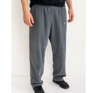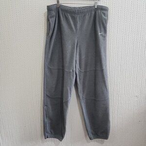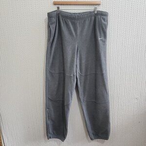 Authentic vintage Nike fleece sweatpants in a soft gray tone with a relaxed, baggy fit. Features the classic red embroidered NIKE logo along the ankle zipper and the swoosh on the thigh. Cozy fleece interior with side pockets and elastic waistband for comfort.