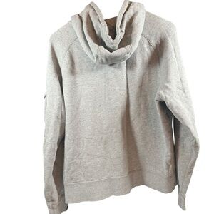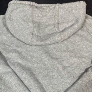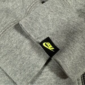 Comfortable gray hoodie. Features full-zip front. Green Nike logo on chest. Arm pocket with zipper.