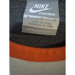 This vintage Nike men's tank top in a size medium features a classic design with a white, blue, orange, and gray color scheme. Made with a comfortable regular fit, this tank is perfect for activewear occasions. The Y2K labeling adds a retro touch to the overall look, making it a unique and stylish addition to any man's wardrobe.