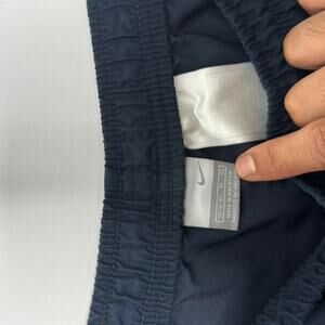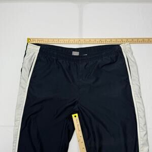 Classic Nike windbreaker-style track pants in navy with contrasting white side stripes. Lightweight, breathable fabric with zippered ankles and an elastic waistband. Embroidered white Nike swoosh on lower leg. Size tag: XL.
