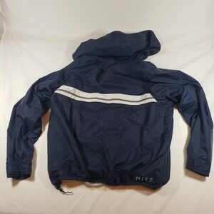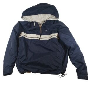 Embrace the timeless appeal of this vintage Nike pullover windbreaker, a nostalgic treasure that effortlessly blends sporty functionality with classic style. Navy blue nylon forms the jacket's shell, accented by bold white stripes across the chest, creating a striking visual contrast. The iconic Nike swoosh is subtly embroidered, a mark of quality and athletic heritage. Practical features include a half-zip front, an adjustable hood, and a drawstring hem for a customized fit. This jacket is ideal for a casual weekend outing, a light workout, or as a stylish layer for outdoor adventures.
