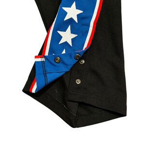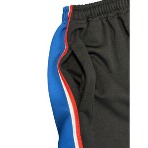 These are pre-owned vintage late 90s-early 00s Nike Philadelphia 76ers basketball pants. They are black with blue and red stripes down the sides. The pants have a drawstring and elastic waistband, two side pockets, and a small Nike logo on the right leg. The pants are in good condition.. The pants are made of a polyester blend and are machine washable. Snaps at the bottom of pants. Please see pictures for condition and measurements