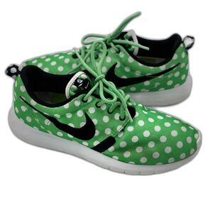 #NikeRoshepolkadot, rare Roshe Run, green Nike sneakers, streetwear, #limitededitionnike Roshe, size 8.5 men’s, size 10 women’s, #unisexsneakers, retro Nike style, collector#sneakers