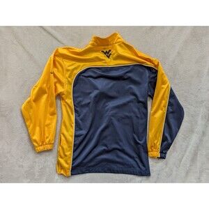 This is a long sleeve button up warm up shooting shirt from West Virginia University