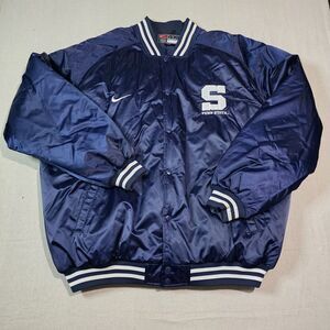 Vintage Nike Team Penn State Satin Navy Blue Puffer Varsity Jacket Size 4XLarge bomber jacket snap button has stain on inside ligning sold as is see pictures for reference and measurements