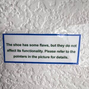 The shoe has some flaws, but the do not affect the functionality. Please refer to the pointers in the picture for details