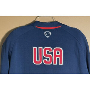 Vintage The Nike US Soccer Jacket is a men's track jacket made of polyester with a solid blue color. This mid-length jacket features a full zip closure, long sleeves, and is machine washable for easy care. The jacket is designed for activewear occasions, specifically for soccer enthusiasts. It showcases the Nike Team USA product line, making it a stylish and functional choice for both winter and summer seasons. The jacket's size XL with a regular fit ensures a comfortable and fashionable look for any soccer fan.