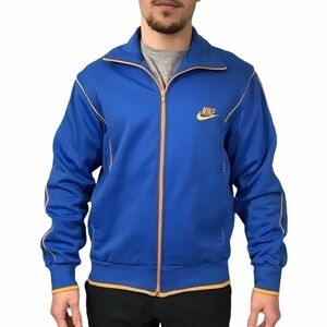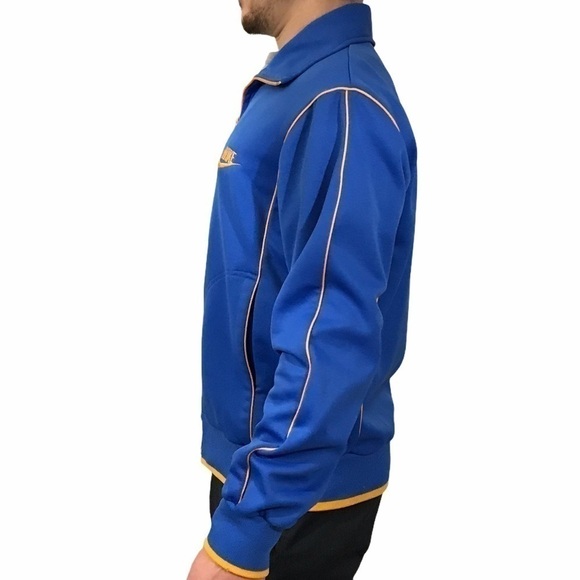 Bright blue with yellow-gold piping,waist band and sleeve cuffs