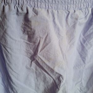- overall dinginess and one paint spot near bottom cuff. I do not do spot treatments but could possibly be removed