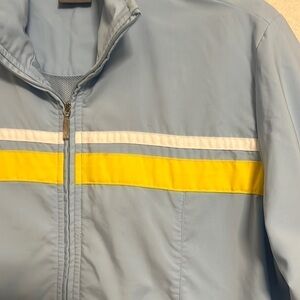 Beautiful Light blue with yellow and white stripes full up jacket with front pockets pre owned gently used no rips or stains see photos for measurements