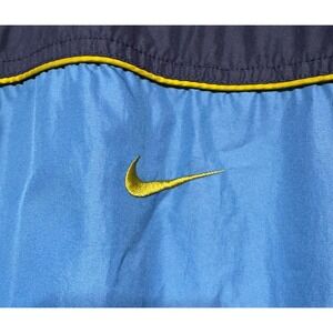 Vintage Nike windbreaker jacket in a bold navy and blue colorblock design with yellow accents. Features a mesh lining, zip pockets, and retro ribbed trims—perfect for layering in transitional weather.