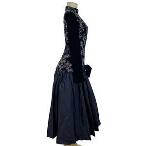Elegant vintage black gown with sequined velvet bodice, full taffeta skirt, large bow detail, and long sleeves. Perfectly balanced design for formal elegance.