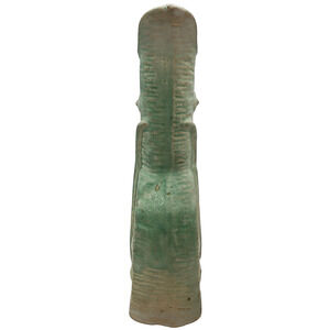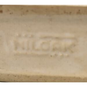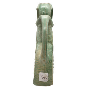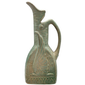 The Vintage Niloak Pottery Flying Eagle Pitcher is a unique and handcrafted piece of American art pottery. Made of green clay with a matte finish, this pitcher features an impressed backstamp with the Eagle brand logo. Produced in the United States using traditional pottery techniques, this antique pitcher is a beautiful addition to any collection of decorative cookware or dinnerware. The intricate Flying Eagle design adds a touch of vintage charm, making it a standout piece for those who appreciate handmade craftsmanship and American heritage.
