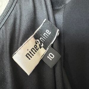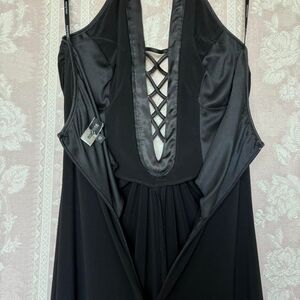 Stunning vintage black halter maxi dress with criss cross detail down the front and ruched along it gives a sexy look. Long slit in front middle. Halter is not a tie. Zipper in back. Stretchy. Brand is Nine 2 Nine. Made in USA