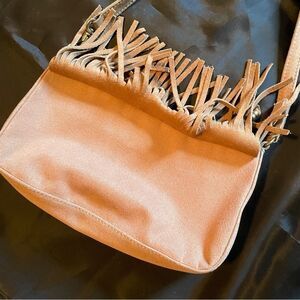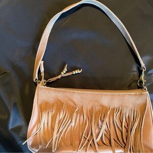 Vintage Nine West BoHo tan leather 5 x 9.5 purse, tassels on both sides. Zipper