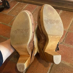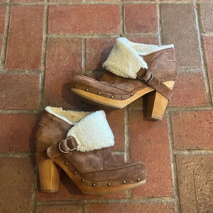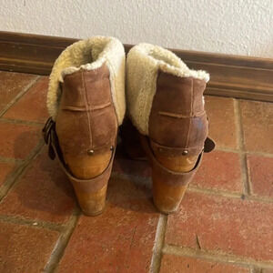 Super chic and cozy warm "Kybele" ankle boots from the Nine West Vintage America Collection. Cognac color suede and natural-color faux shearling. 4.5” wood heel 1” platform