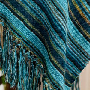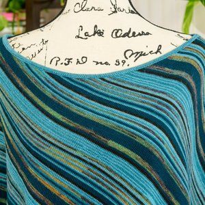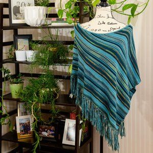 Vintage Nine West Knit Poncho in teal & brown stripes w/ tassels circa 2005. One Size. Acrylic & Merino Wool. Gently used, excellent condition. I noticed one small pull in the threads, but it's not visible.