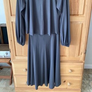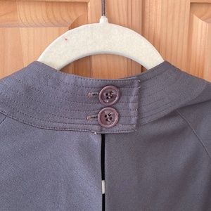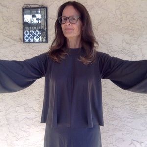 Top is about a 4 to 6 in size. It is very flowing in fit. The color is a dark taupe. Good condition overall