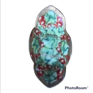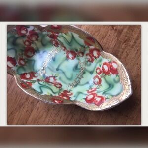 Beautiful Vintage Nippon Hand painted Japanese oval bowl dish - green with red flowers and gold trim