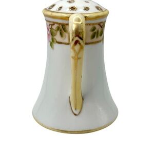 Vintage Nippon Hand-Painted Porcelain Sugar Shaker, also known as a muffineer. These shakers were popular during the Victorian era and were used for sprinkling sugar on foods like muffins. Made in Japan between 1891 and 1921. The antique porcelain sugar shaker features hand-painted floral designs and gold accents. Approximately 4” high.