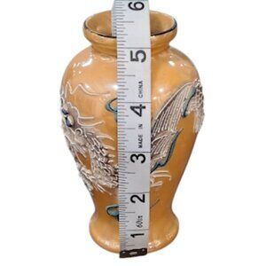 The Vintage Nippon Japan Dragon Ware Moriage Porcelain Vase is a collectible piece from Japan, showcasing traditional Japanese culture."Moriage" refers to a raised decoration technique where slip (a thick mixture of clay and water) is applied to pottery, creating a three-dimensional effect, often resembling piping or piling up. This small vase measures 5x3 inches and features intricate dragon designs, typical of Asian art and craftsmanship. The high-quality porcelain material and detailed artwork make this vase a unique and decorative piece for any collector or admirer of Japanese aesthetics.