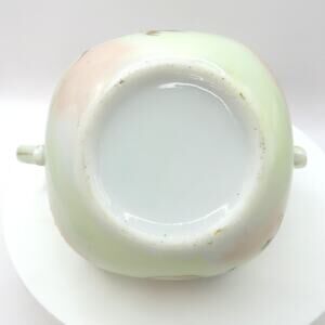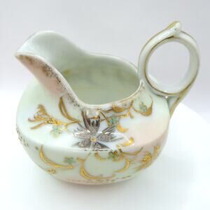 This is a stunning antique hand-painted porcelain creamer and sugar bowl set featuring a rare square-round form with intricate Moriage-style decoration. The design showcases delicate raised gold, silver, and enamel floral accents over a soft pastel glaze in pale green and blush tones. Likely Japanese export ware from the late 19th to early 20th century, this set reflects the elegance of Nippon-era craftsmanship, although it is unmarked.