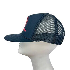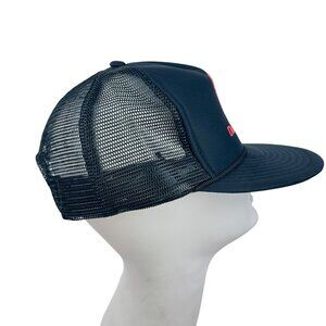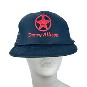 Show your racing pride with this vintage Davey Allison #28 snapback trucker hat by Nissin. This classic navy blue cap features bold red embroidery with a five-pointed star and the iconic number 28, honoring the legendary NASCAR driver. Made from foam-front fabric with a breathable black mesh back, it has an adjustable snapback strap for a one-size-fits-all fit. A great collectible for racing fans or vintage hat collectors.