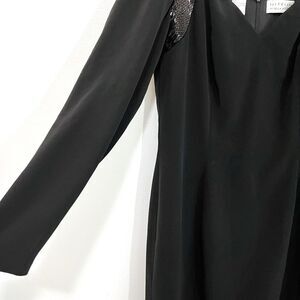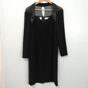 Absolutely stunning structured black dress perfect for many formal occasions. Features a chic beaded collar, 100% silk sheer shoulder detail, and seams running down the middle for a flattering fit.
