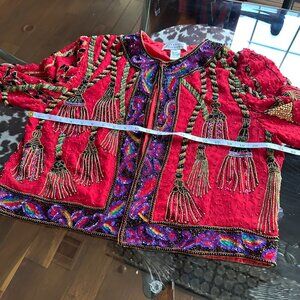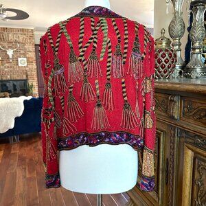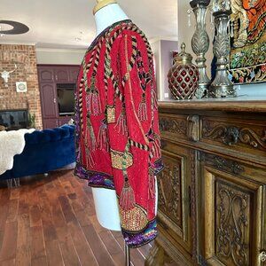 Vintage Niteline By Della Roufogali Red Silk Sequins Tassel Holiday Jacket Sz L
