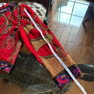 Vintage Niteline By Della Roufogali Red Sequins Tassel Jacket. Women's size large. Red silk with poly lining. Made in India. Gorgeous beaded and sequined tassels design. Single hook eye closure. Nice weight. Perfect for holiday events. Issues: There are some spots with loose threads/ missing sequins and beads. There are two areas close to each shoulder with a hardened white spot that could be some type of adhesive. There is about a 1/4" hole in the top layer of silk inside one of these white spots as pictured. All of these issues could be repaired, or the jacket can be worn as-is.