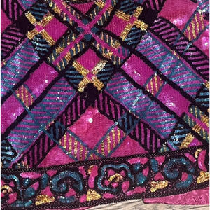 Designer size tag is loose on one side - captured in provided photos. Light overall wear to sequins, typical for vintage. No major bald spots or loose threads. Good clean pre-owned condition.