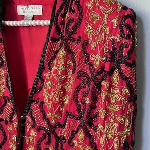 Absolutely stunning Niteline by Della Roufogali beaded silk jacket in red, black and gold. Silk lined, hook and loop closure down the front.