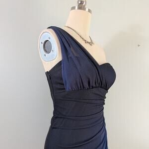 Stretch knit with glitter and side ruffle. One shoulder bust and ruching at sides with fairy goth, glam, midnight starry sky, classic, retro, and movie star vibes. Perfect for formal, black tie, holiday party, pageant, red carpet, wedding guest, prom, hoco homecoming dance, special occasion, gala, quinceañera, fundraiser event, ball, opera, evening, graduation, or banquet. Made in the USA.