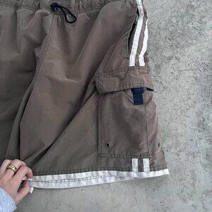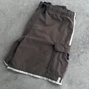 Vintage y2k nylon shorts by No Boundaries. Could be swim trunks or just casual shorts. Inner mesh netting built in. Great basic brown color with white stripes and cargo pockets. Elastic waistband with cord pull, elastic still intact. Cotton, polyester, and nylon material blend
