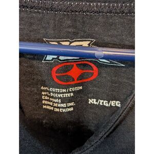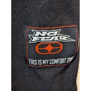 This vintage No Fear jersey rocks that classic late-90s energy — black with white pinstripes, big NF logo up front, and “NO FEAR” blasting across the back like you just kickflipped over a snake pit.