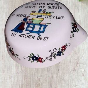 This here is a wonderful Vintage Ceramic Wall Pocket. Crafted in the depiction of a hanging frying pan, the phrase “ No Matter Where I Serve My Guests, It Seem They Like My Kitchen Best “ is lettered among an image of a woman at the oven with floral and kitchen teapot tea kettles around the border and handle. Measuring appr length, 6 1/4”width and appr 1 1/2” depth and 9” long, this piece is in good condition showing no chips or cracks to the ceramic and only minor wear from age and handling, with some light wear to the lettering in spots. Marked P408 made in Japan.