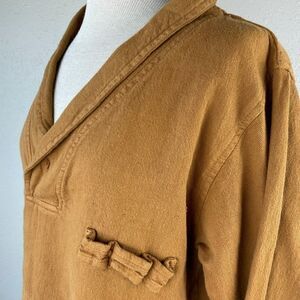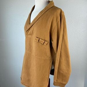 Crazy cool and unique retro 80/90s carpenters outfit. The smock top is a size small and measures 21 inches armpit to armpit laying flat and 27 inches from shoulder to hem. The pants measure 14 inches at the elastic waist and has a 30 inch inseam.