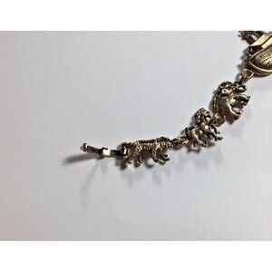 This Vintage Noah's Ark Chunky Bracelet features a gold tone link charm design, measuring 7.5 inches in length. The bracelet is themed around religious symbolism, making it a unique and meaningful accessory for those with a faith-based style. The charm bracelet is designed with a chunky style, showcasing various animal charms reminiscent of the biblical story of Noah's Ark.