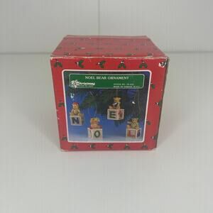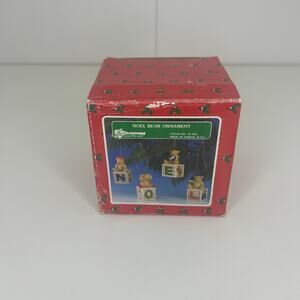 Set of 4 vintage Christmas Around the World Noel Bear Ornaments (Stock No. 54-433), complete with the original red holly box. Each ornament features a teddy bear sitting on a block spelling out N-O-E-L, with additional holiday-themed images on the block sides (snowman, drum, train, bell, harp, etc.).
