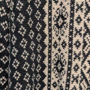 This is a very heavy, beautifully designed zip-up cardigan by Nomadic Traders of Berkely, California. It is black and white with a Norwegian slant to it.