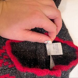 Size medium. Armpit to armpit is about 20 inches, with about 21 inches in length. Overall good preowned condition, there is a spot of pink colored yarn in the arm, pictured. This is a manufacturing error. Gray and red sweater.