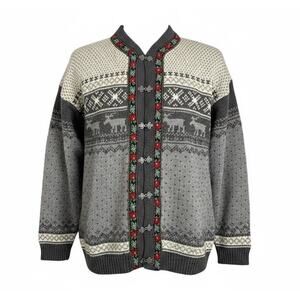 Vintage Nordic Wool Cardigan Sweater Gray Fair Isle Reindeer Pattern XL