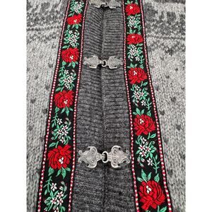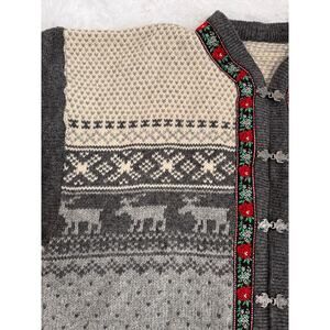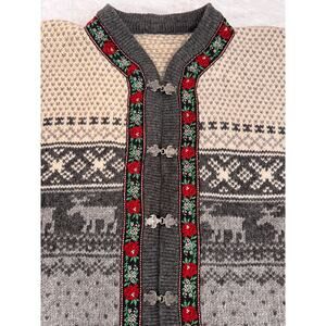 Cozy vintage Nordic cardigan sweater in gray and cream with traditional Fair Isle and reindeer patterns. Features beautiful red and green floral trim, ornate silver-tone hook closures, and a thick wool-blend knit for warmth and structure. Classic Scandinavian style with timeless charm — perfect for ski season, cottagecore layering, or holiday looks. Unisex fit, soft interior, and gorgeous craftsmanship throughout.