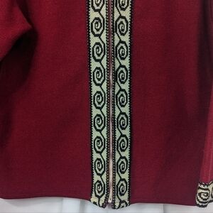 This sweater is in gently used condition. It is 100% wool. It was made in Germany. Age is based on the zipper, Talon. Missing size tag, size based on similar items. Wear on the collar detail. Missing button and chain at neck. Please see photos for details.