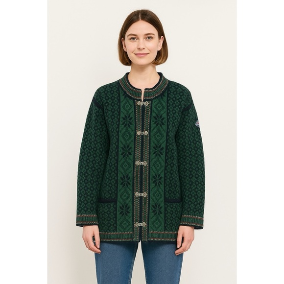 Vintage Nordstrikk womens cardigan jacket virgin wool green navy pewter clasp L