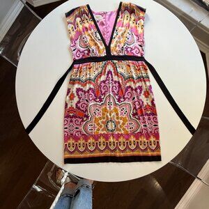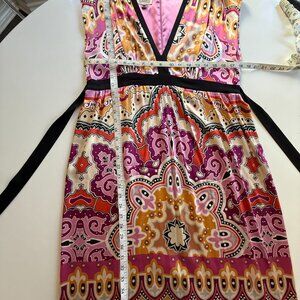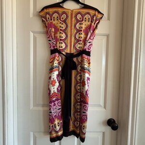 Lovely, ultra-flattering silk "foulard" dress purchased at Nordstrom. In excellent used condition. Beautiful pattern in pink, orchid, orange, gold, silver, and white, contrasted by a bold black border and Empire waist back tie.